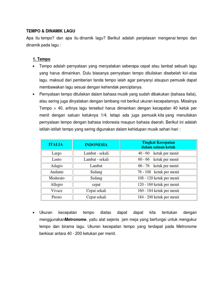 Apa yang Dimaksud dengan Tempo. Tekanan ini juga adalah bertujuan untuk memberitahu akan tahap kekuatan dan kelembutan mengenai sesuatu not dalam muzik. Melodi susunan pic secara melintang Pic tinggi dan pic rendah - menaik menurun mendatar Pic dalam melodi boleh bergerak menuju arah tinggi rendah mendatar - jeda Pic boleh bergerak secara bertangga melompat - skel.